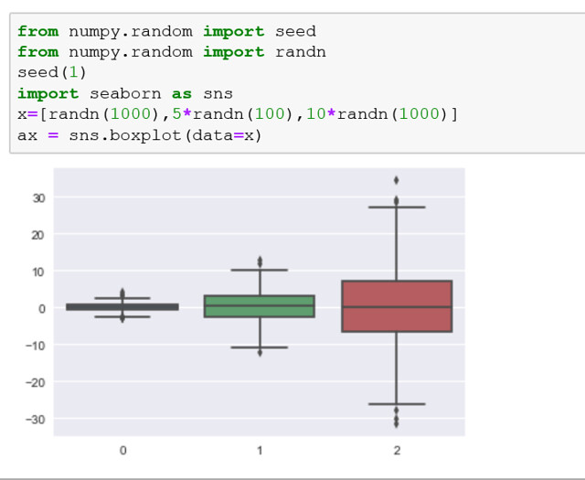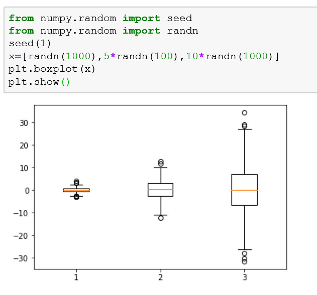El ejemplo crea tres diagramas gráfico, cada uno de los cuales resume una muestra de datos extraída de una distribución gaussiana ligeramente diferente. Cada muestra de datos se crea como una matriz y las tres matrices de muestras de datos se agregan a una lista que se rellena a la función de trazado.