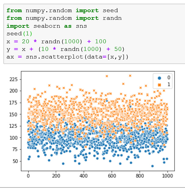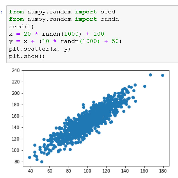 El ejemplo crea dos muestras de datos que están relacionadas. La primera es una muestra de números aleatorios extraídos de un gaussiano estándar. El segundo depende del primero al agregar un segundo valor gaussiano aleatorio al valor del primer compás.