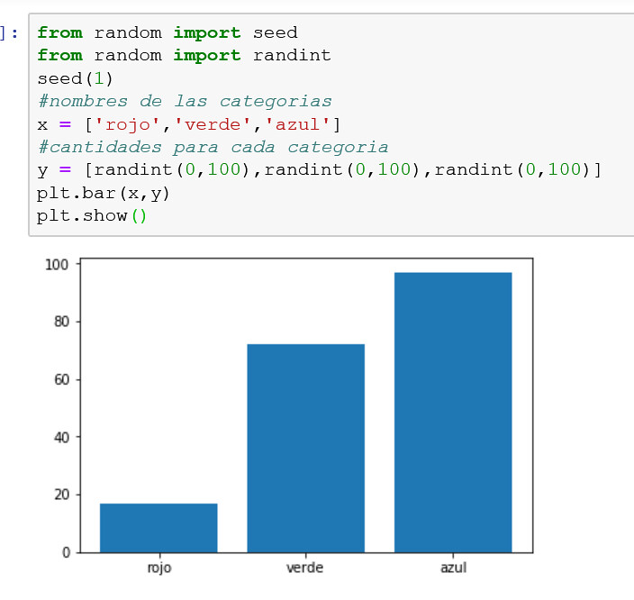Se puede crear un gráfico de barras llamando a la función bar() y pasando los nombres de las categorías para el eje x y las cantidades para el eje y.